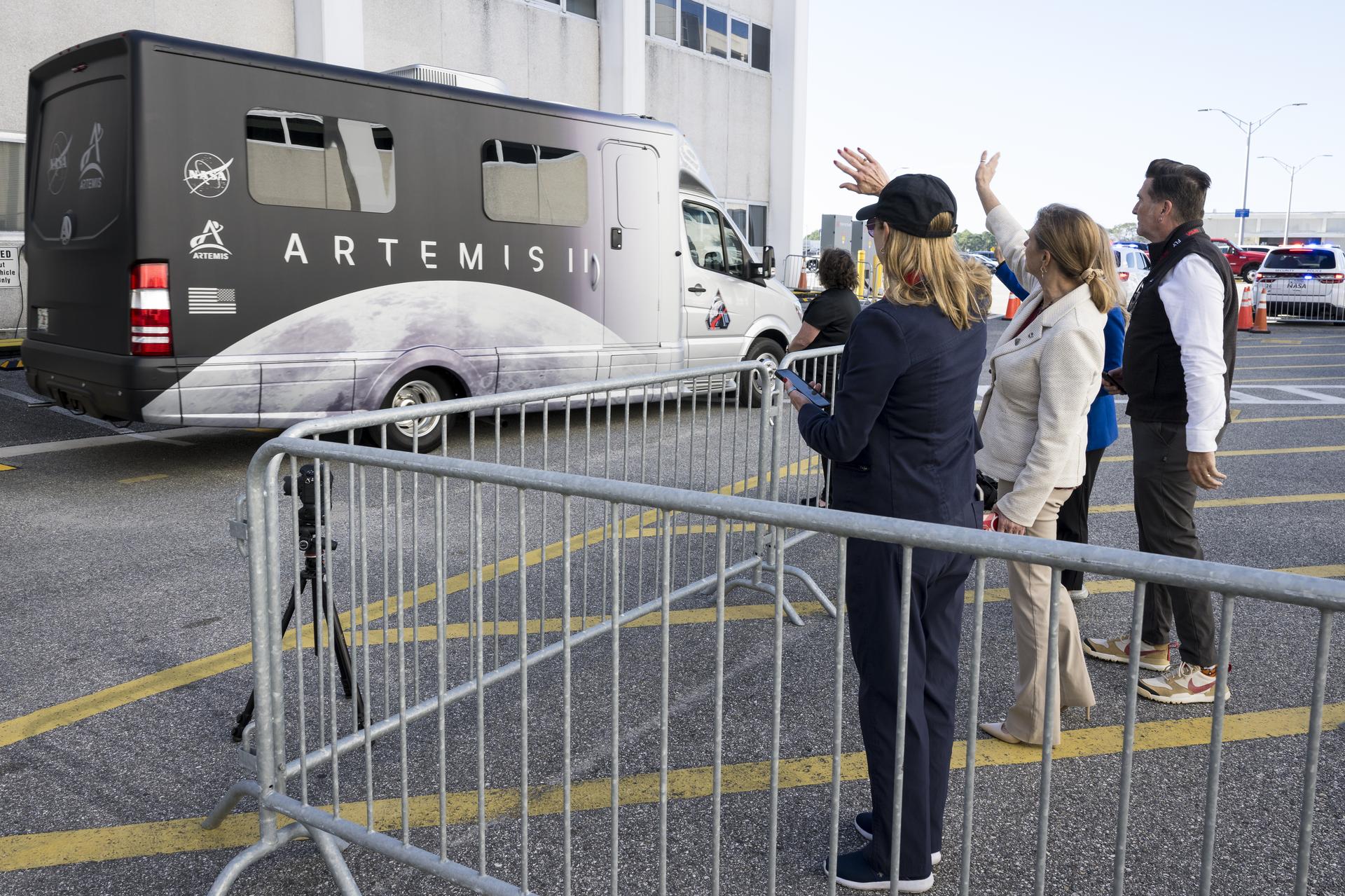ลูกเรือทั้งสี่จะเดินมาขึ้นรถ Astrovan ที่จอดอยู่ ด้านหลังจะเห็นเจ้าหน้าที่หน่วย SWAT คอยรักษาความปลอดภัย ที่มา – NASA/Aubrey Gemignani