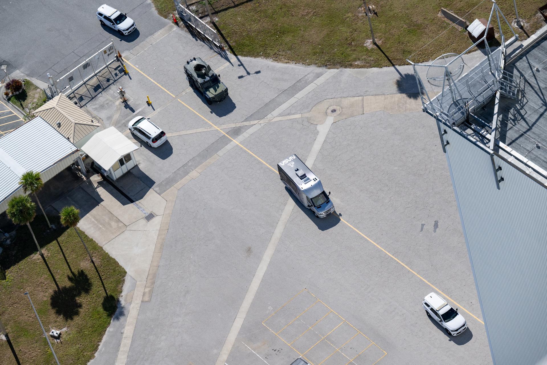 ขบวนรถเลี้ยวขวาเพื่อเข้าสู่โซนฐานปล่อย LC-39A และ LC-39B ภาพนี้ถ่ายลงมาจากตึก VAB ที่มา – NASA/Keegan Barber