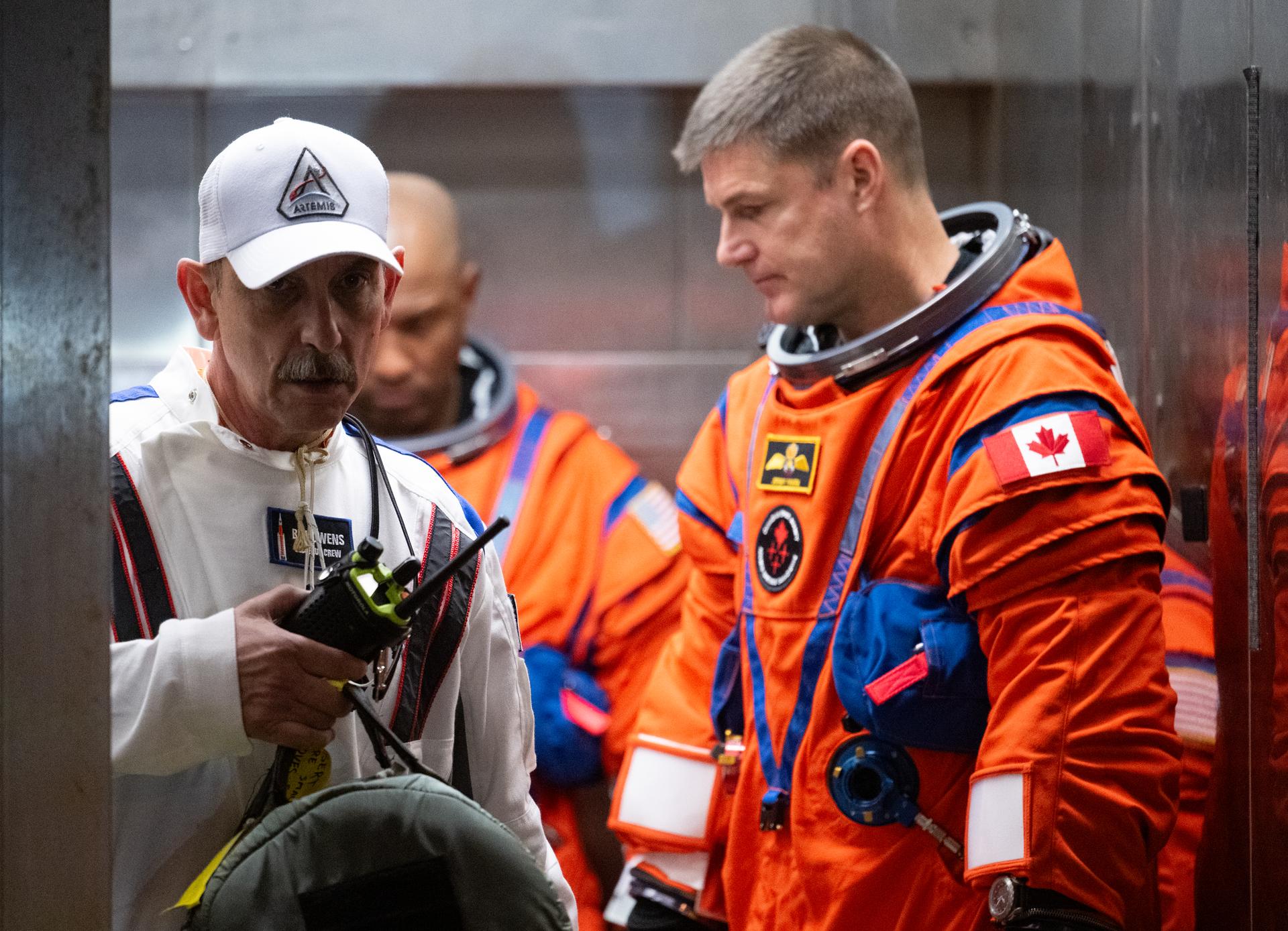 หลังจากการสวมชุดและการตรวจสอบทางการแพทย์ขั้นสุดท้าย Reid Wiseman ในฐานะผู้บัญชาการภารกิจ Victor Glover ในบทบาทนักบิน Christina Koch ผู้เชี่ยวชาญภารกิจ และ Jeremy Hansen นักบินอวกาศจากแคนาดา จะถูกนำไปยังลิฟต์ของอาคาร O&C Facility ลิฟต์นี้เป็นเส้นแบ่งทางสัญลักษณ์ระหว่างโลกภายในอาคารกับพื้นที่ปฏิบัติการภายนอก เมื่อประตูลิฟต์เปิดออก พวกเขาจะก้าวออกมาที่ทางเดินซึ่งนำไปสู่ซุ้มประตูโค้งที่เป็นเอกลักษณ์ จุดที่กลายเป็นภาพจำของนักบินอวกาศทุกยุคตั้งแต่ Space Shuttle มาจนถึง Artemis