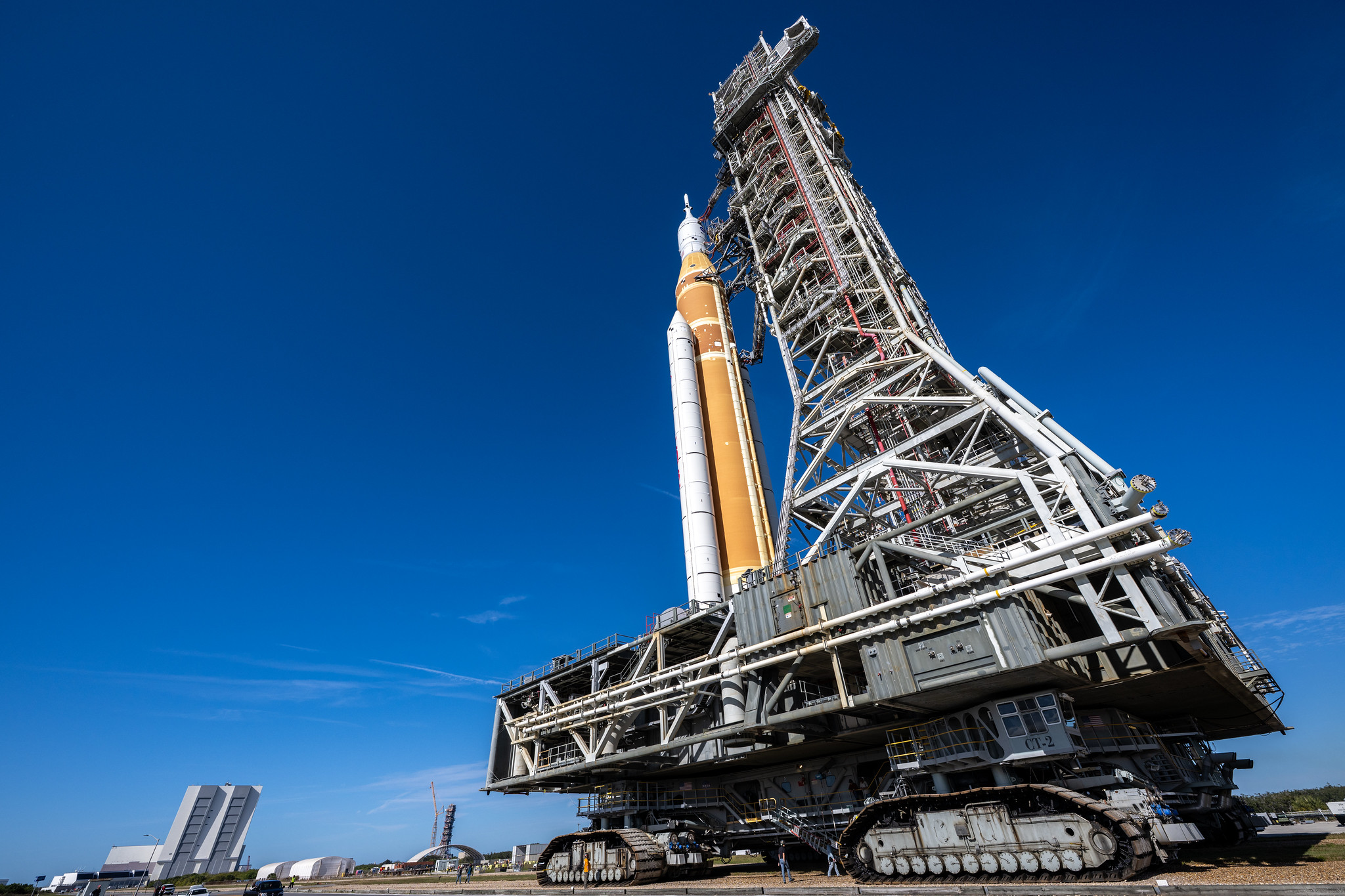 หัวใจสำคัญของการเคลื่อนย้ายจรวดที่มีความสูงกว่า 98 เมตร และมีน้ำหนักรวมกว่า 2.6 ล้านกิโลกรัม คือเครื่องจักรขนาดมหึมาที่ชื่อว่า Crawler-Transporter 2 หรือ CT-2 ซึ่งเป็นรถตีนตะขาบที่ถูกใช้งานมาตั้งแต่ยุค Apollo แต่ได้รับการปรับปรุงใหม่ทั้งหมดเพื่อรองรับ SLS ตัวรถมีน้ำหนักกว่า 3 ล้านกิโลกรัม และทำหน้าที่ช้อนใต้โครงสร้าง Mobile Launcher 1 หรือ ML-1 ซึ่งเป็นหอคอยเหล็กที่สูงกว่า 115.8 เมตรที่เป็นฐานรองรับจรวด การเดินทางจากอาคาร VAB สู่ฐานปล่อย LC-39B มีระยะทางประมาณ 6.7 กิโลเมตร โดยใช้ความเร็วสูงสุดเพียง 1.3 กิโลเมตรต่อชั่วโมงเท่านั้น ความเร็วที่เชื่องช้านี้เป็นไปเพื่อรักษาความเสถียรของระบบ Inertial Measurement Unit หรือระบบวัดความเฉื่อยภายในยาน Orion ไม่ให้ได้รับผลกระทบจากแรงสั่นสะเทือนที่มากเกินไป