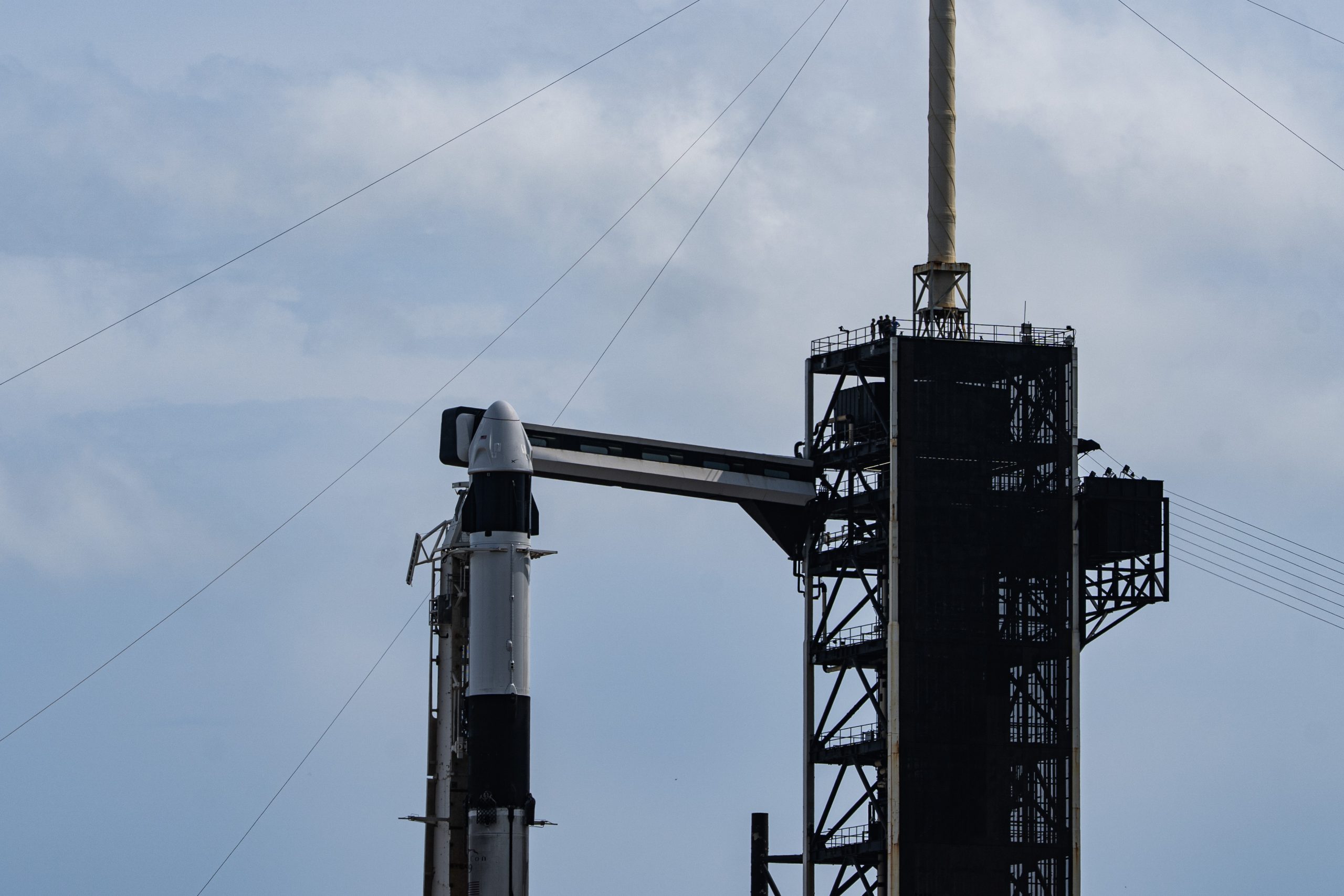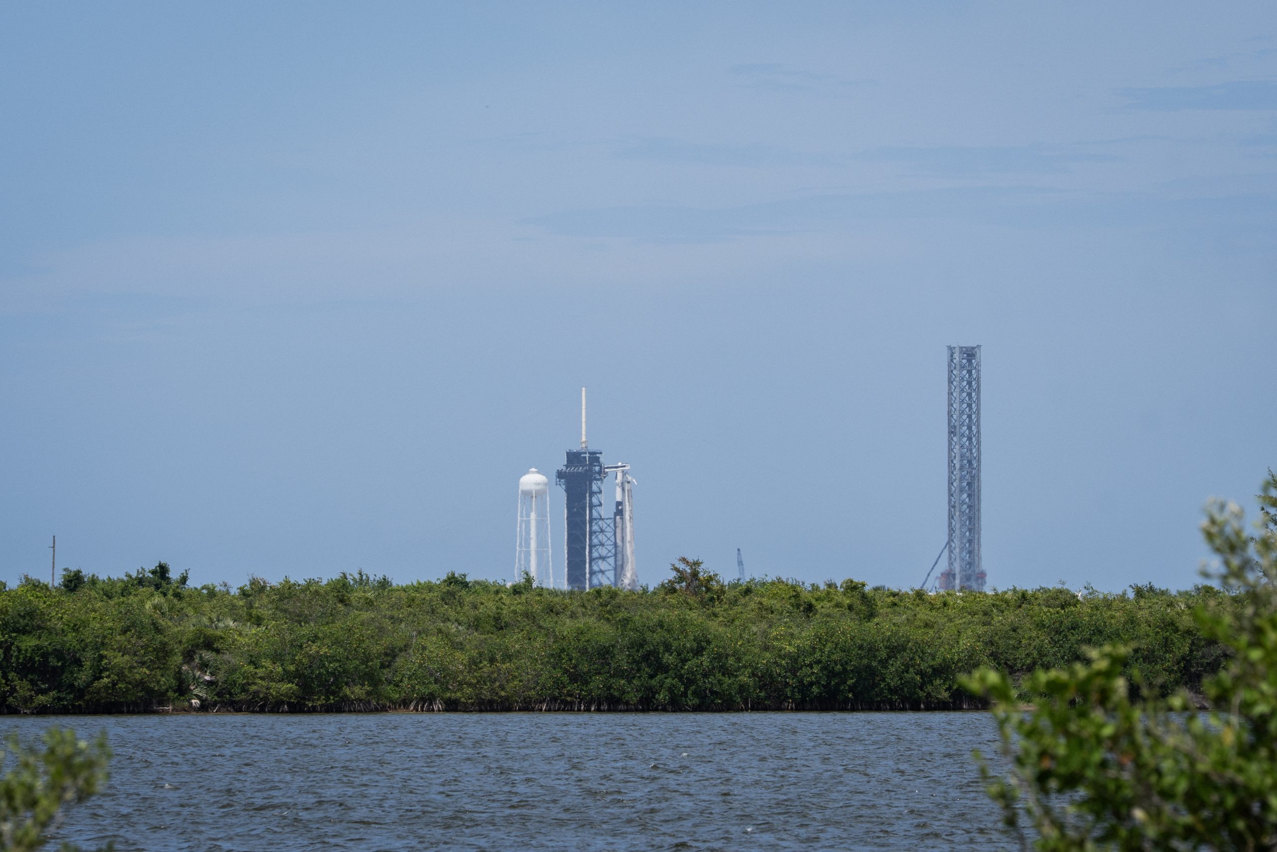จรวด Falcon 9 และยาน Dragon บนฐานปล่อย LC-39A ใน NASA Kennedy Space Center ถ่ายจากบริเวณ Press Site ที่มา – Nattanon Dungsunenarn/Spaceth