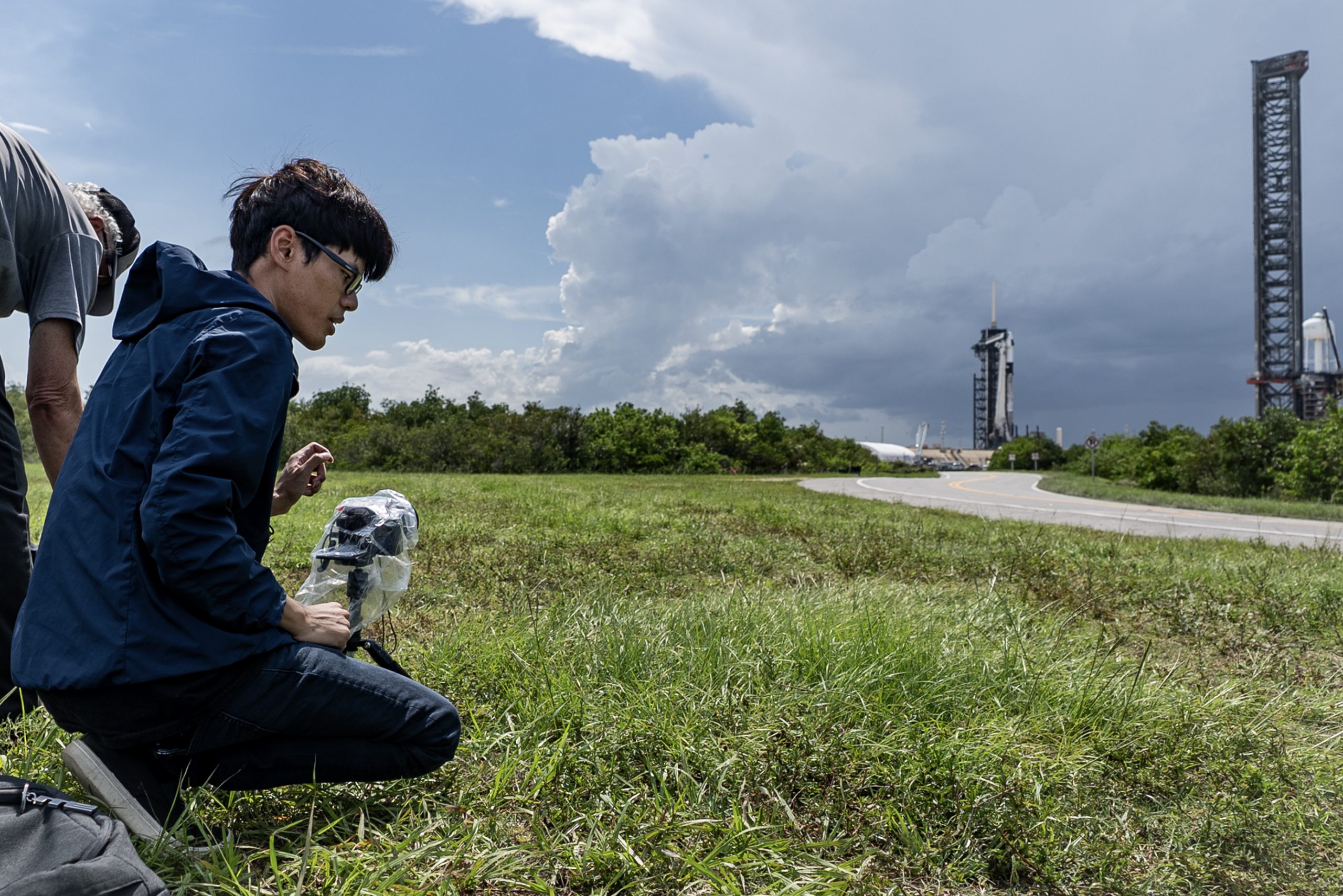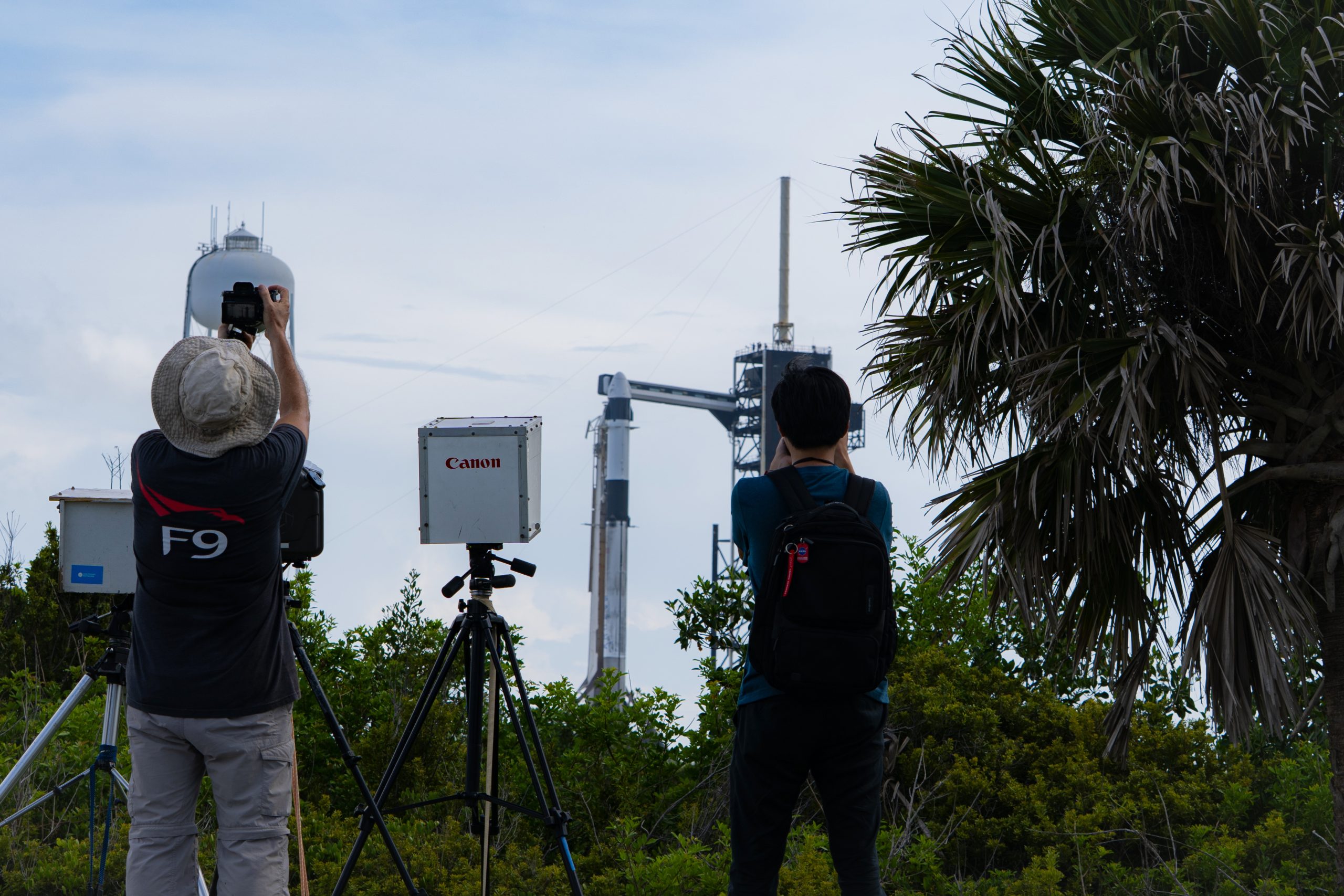 หลังจากที่นั่งรถผ่านบริเวณฐานปล่อยแล้ว เราก็มาหยุดบริเวณที่ห่างจากฐานปล่อยประมาณ 800 เมตร ซึ่งเป็นจุดที่เป็นสนามหญ้าที่เราจะตั้งกล้องกัน บริเวณนี้เราจะเห็นจรวด Falcon 9 และยาน Dragon ได้อย่างชัดเจน โดยปกติแล้วในกระบวนการปล่อยนั้น SpaceX จะเริ่มเคลียร์คนออกจากฐานปล่อยในระหว่างที่จรวด Falcon 9 กำลังเติมเชื้อเพลิง ซึ่งจะเป็นช่วงเวลาประมาณ 45 นาทีก่อนการปล่อย ซึ่ง ณ ตอนนั้นลูกเรือทั้ง 4 จะขึ้นไปบนยาน Dragon เรียบร้อยแล้ว