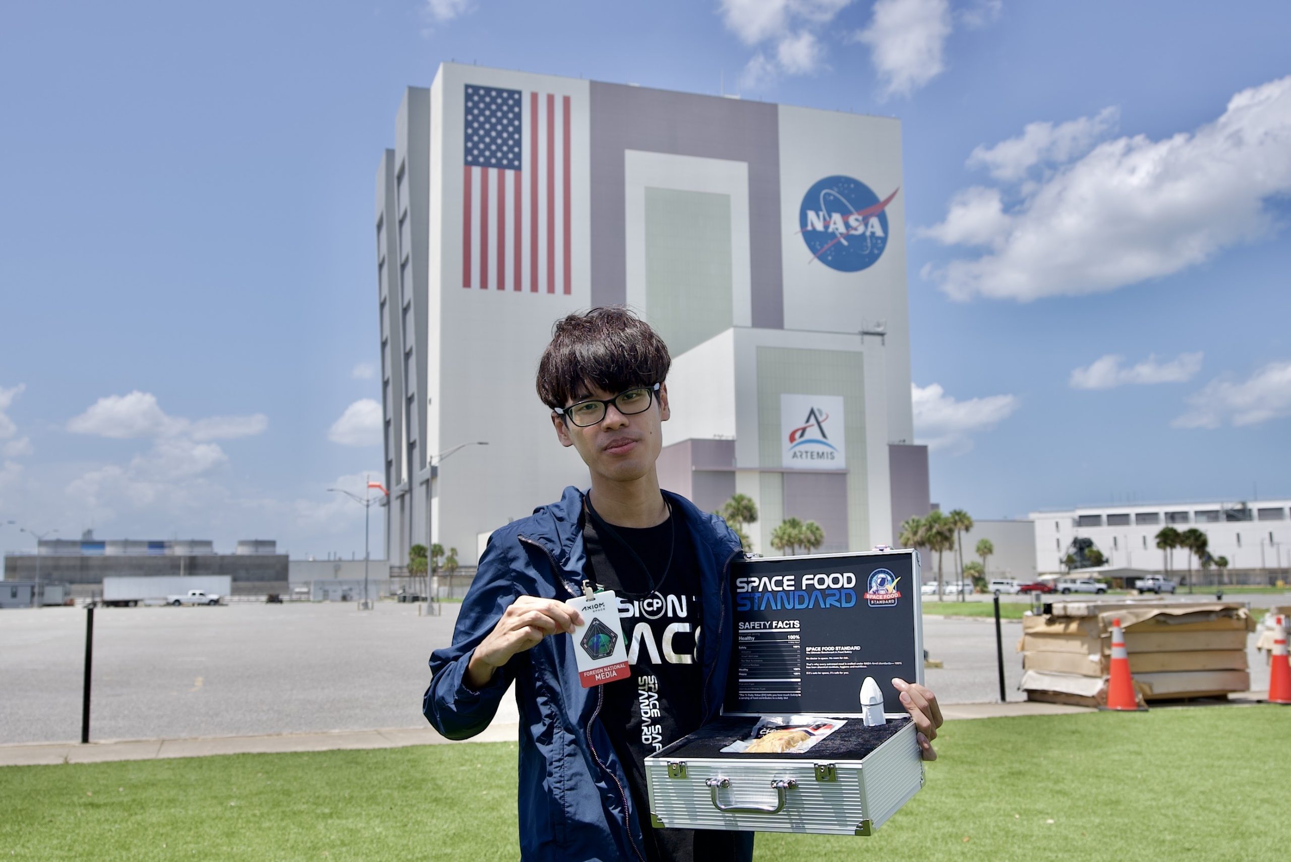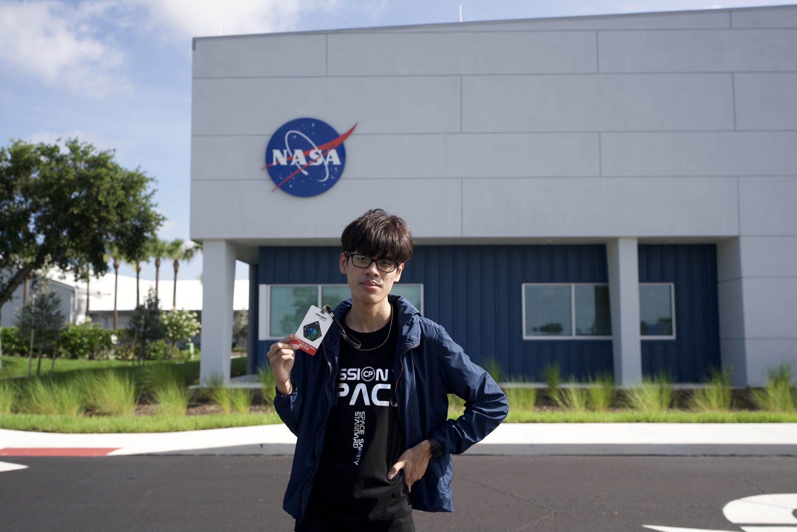 ผมขณะโชว์ป้ายสื่อประจำภารกิจ Axiom Mission 4 ที่ด้านหน้า NASA Kennedy Space Center Visitor Complex ในฟลอริดา สหรัฐอเมริกา ที่มา – Kornthong Wiriyasawetkul/Spaceth