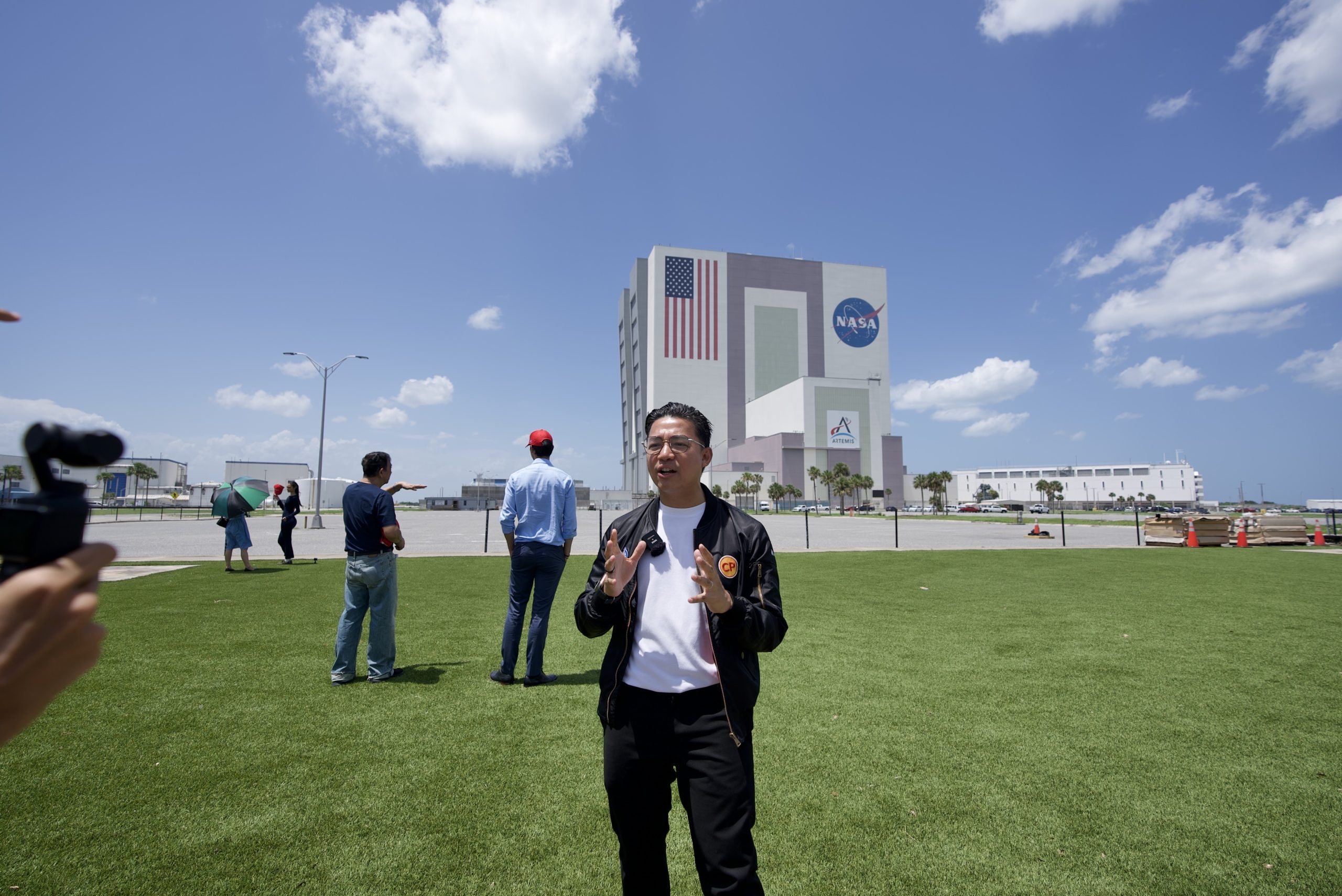 พี่หนุ่ย พงศ์สุข กับบรรยากาศด้านหน้าอาคาร Vehicle Assembly Building อันโด่งดังของ NASA ที่มา – Nattanon Dungsunenarn/Spaceth