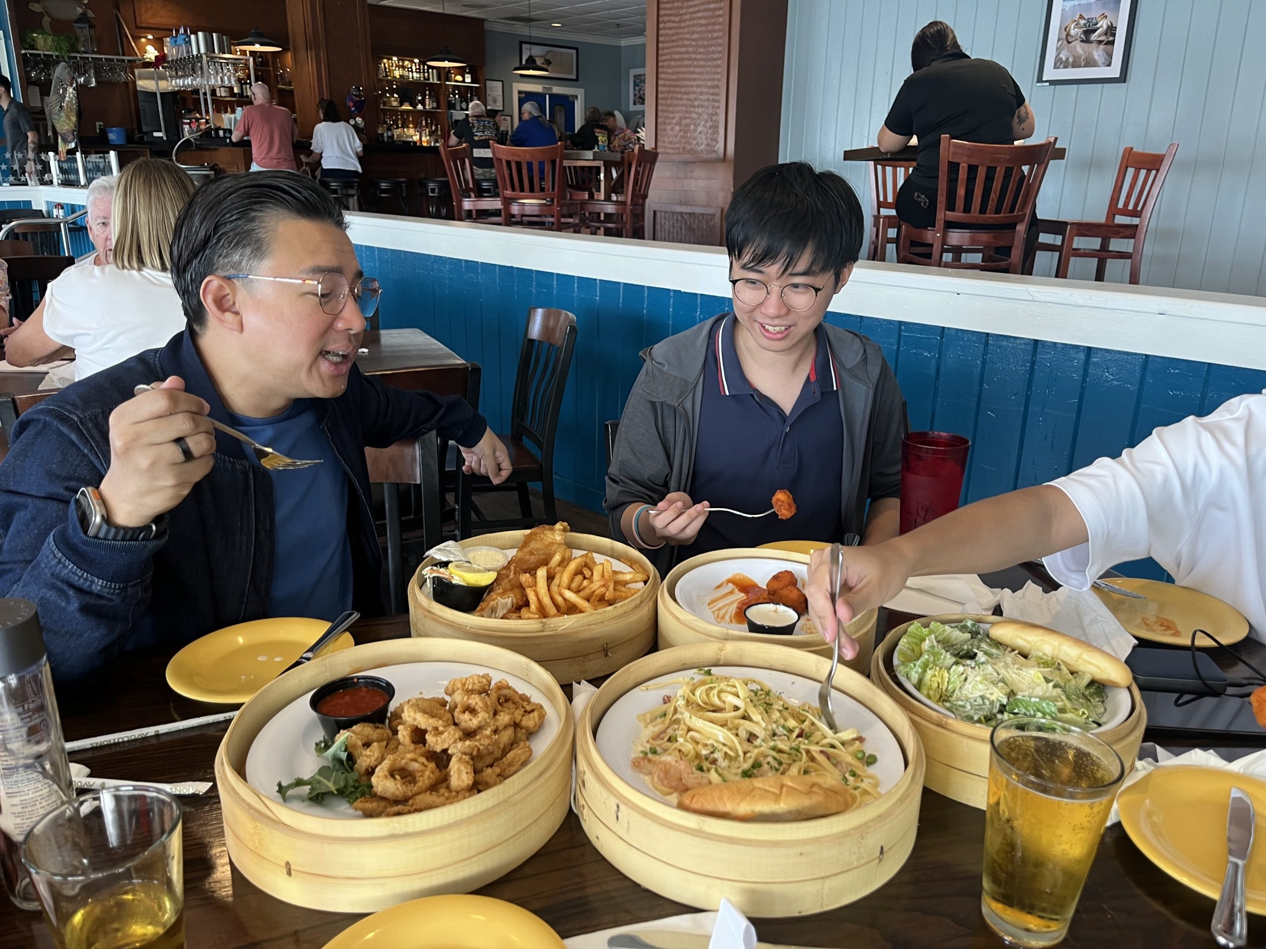 สำหรับมื่อเที่ยงวันนี้เราไปรับประทานอาหารกันที่ร้าน Fishlips ซึ่งเป็นร้านโปรดของผมที่ท่าเรือคะเนอเวอรัล ความพิเศษก็คือนอกหน้าต่างร้าน คือภาพของฐานปฏิบัติการทางทะเลของ SpaceX ที่ใช้ในการเก็บกู้จรวด Falcon 9 ซึ่งก็ถือว่าโชคดีมาก ๆ ที่วันนี้ มีจรวด Falcon 9 ถึงสองลำอยู่ระหว่างการนำขึ้นจากเรือโดรน Just Read the Instruction ที่เพิ่งกลับมาจากการทำภารกิจไม่กี่วันก่อนหน้า