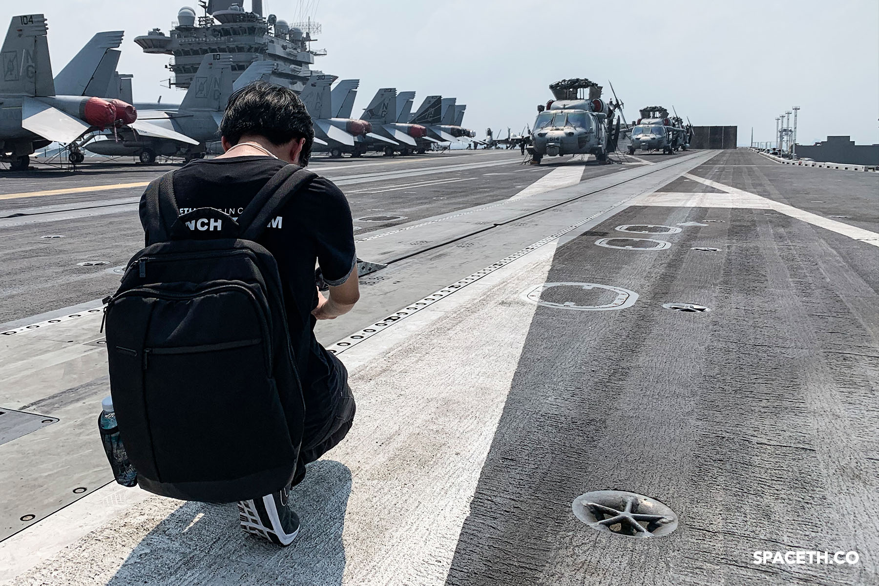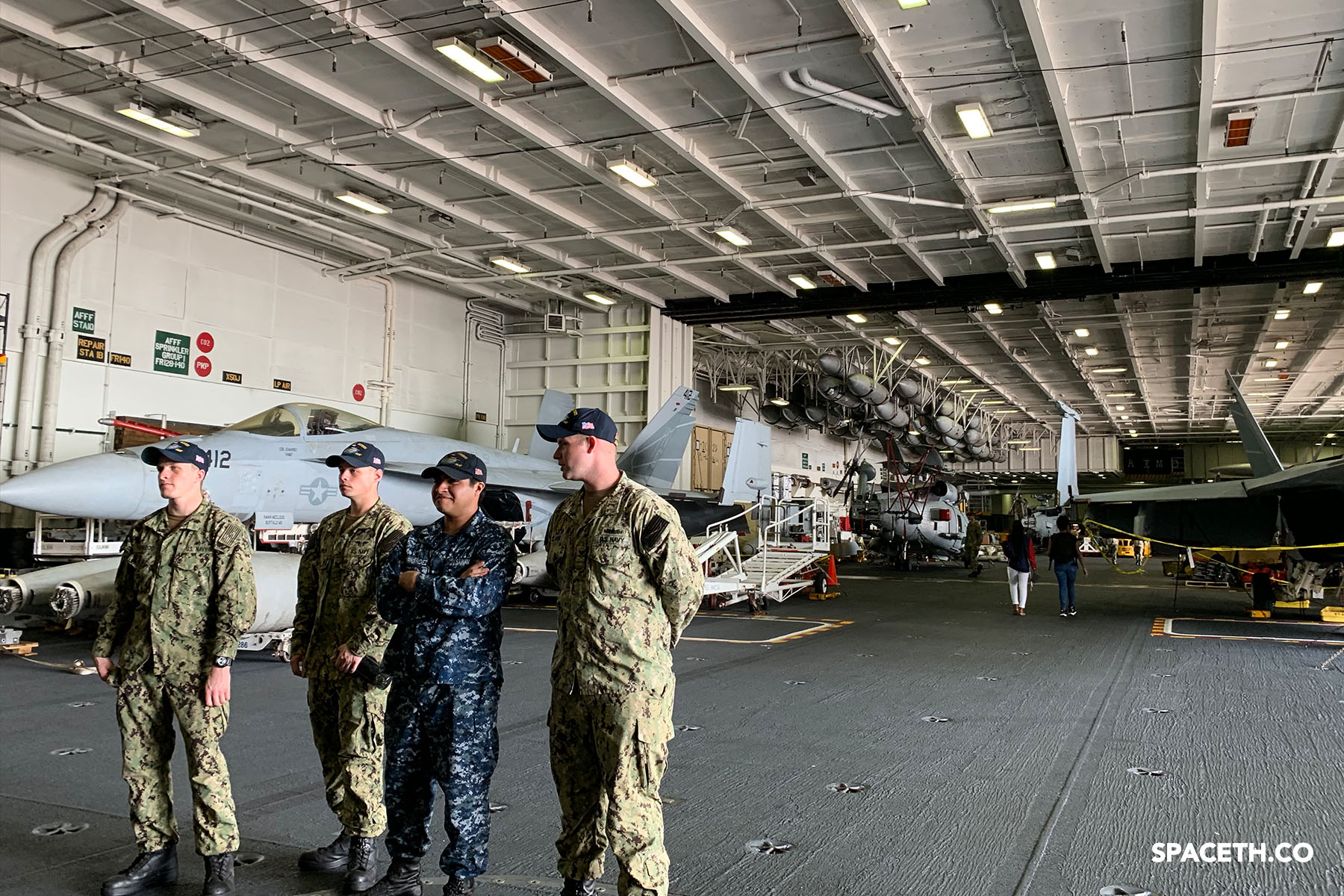 แน่นอนว่าเราสามารถเดินถ่ายรูปกับ F-18 ได้ตามใจชอบ ถ่ายแม่งทุกลำเลยก็ได้ เพราะบนนี้ถ้าประเมินจากสายตาน่าจะมีอยู่ไม่ต่ำกว่า 30 ลำเลยทีเดียว ร่วมกับเครื่องบินอื่น ๆ เช่น C-2 Greyhound (เครื่องบินขนส่ง) และ E-2 Hawkeye (เครื่องบินเรดาร์ที่จะมีโดม ๆ กลม ๆ หมุน ๆ อยู่ด้านบน)