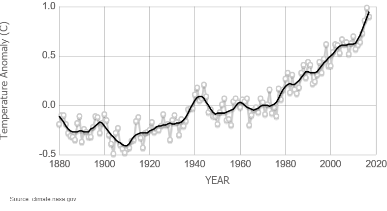 กราฟอุณหภูมิโดยเฉลี่ยที่แสดงให้เห็นถึงการเพิ่มสูงขึ้นของอุณหภูมิโลกอย่างต่อเนื่อง เนื่องจากกิจกรรมของมนุษย์ตั้งแต่ยุคปฏิวัติอุตสาหกรรม ที่มา NASA