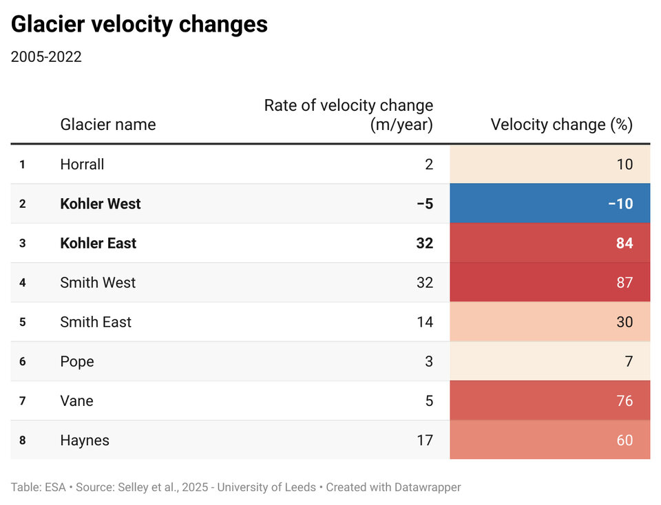 ตารางแสดงอัตราการเปลี่ยนแปลงของการไหลของธารน้ำแข็งใน 8 สายธารน้ำแข็ง ที่มา – ESA