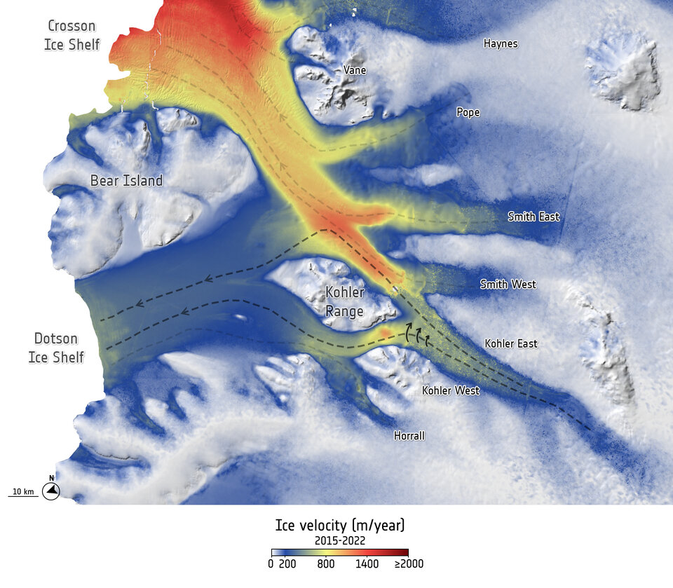 ภาพแสดงการดูดหรือขโมยน้ำแข็งจากฝั่ง Kohler West ไปยังฝั่ง Kohler East ซึ่งไหลออกที่ชั้นน้ำแข็ง Crosson ซึ่ง Assume ได้ว่ามีอัตราการละลายที่สูงกว่า Dotson ที่มา – ESA
