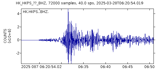 ภาพสัญญาณคลื่นแผ่นดินไหวจากเหตุการณ์ 28 มีนาคม 2025 ที่ตรวจจับได้จากเครื่องวัดแผ่นดินไหวที่ฮ่องกง ในเครือข่าย Global Seismographic Network ภาพจาก SAGE