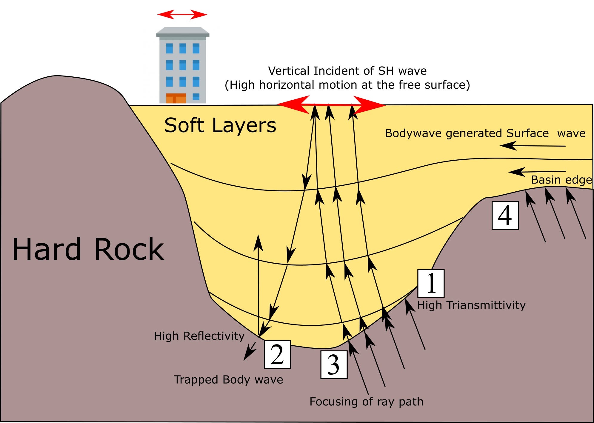 อย่างเช่นแผ่นดินไหวใน 28 มีนาคม 2025 คลื่นแผ่นดินไหวที่มาสั่นก็มาจาก รอยเลื่อนสะกาย (Sagaing Fault) ที่อยู่ห่างจากกรุงเทพมากกว่าพันกิโลเมตร พลังงานของการสั่นสะเทือนจริง ๆ ควรจะลดลง แต่มันกลับรู้สึกถึงแรงสั่นสะเทือนที่เยอะอยู่นั้นก็เป็นเพราะว่าใต้ผืนดินของเรามันเป็นแอ่งกระทะ หมายความว่าคลื่นที่เดินทางมาชนกับแอ่งกระทะของเรามันจะสะท้อนกลับขึ้นไปด้านบน เหมือนกับเป็นจานรับสัญญาณดาวเทียมที่รับสัญญาณที่มาจากทุกทิศทางและสะท้อนไปที่จุดโฟกัส ดังนั้นพลังงานการสั่นสะเทือนจึงเคลื่อนตัวขึ้นมาด้านบนพื้นดินบริเวณพื้นที่ราบลุ่ม กรุงเทพมหานครก็เช่นกัน นั้นทำให้พื้นที่ราบลุ่มภาคกลางที่เหมือนจะไร้แนวรอยเลื่อนแผ่นดินไหว ก็กลับเป็นพื้นที่เสี่ยงภัยแผ่นดินไหวได้