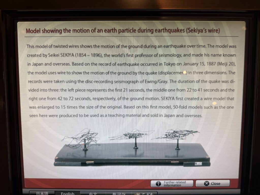 ภาพถ่ายแบบจำลองการสั่นสะเทือนแบบสามมิติ สร้างโดย เซคิ เซคิยะ (Seikei Sekiya) ศาสตราจารย์ด้านแผ่นดินไหววิทยาคนแรกของโลก โมเดลนี้อ้างอิงจากข้อมูลการเกิดแผ่นดินไหวในโตเกียวเมื่อวันที่ 15 มกราคม ค.ศ. 1887 (ปีเมจิที่ 20) โดยใช้เส้นลวดเพื่อแสดงการเคลื่อนที่ (displacement) ของพื้นดินใน 3 มิติ และจากการศึกษานี้ทำให้เราเข้าใจเกี่ยวกับ Chracteristic ของแผ่นดินไหวในพื้นที่ต่าง ๆ ได้มากขึ้นเป็นอย่างมาก ภาพ – Jirasin Aswakool/Spaceth