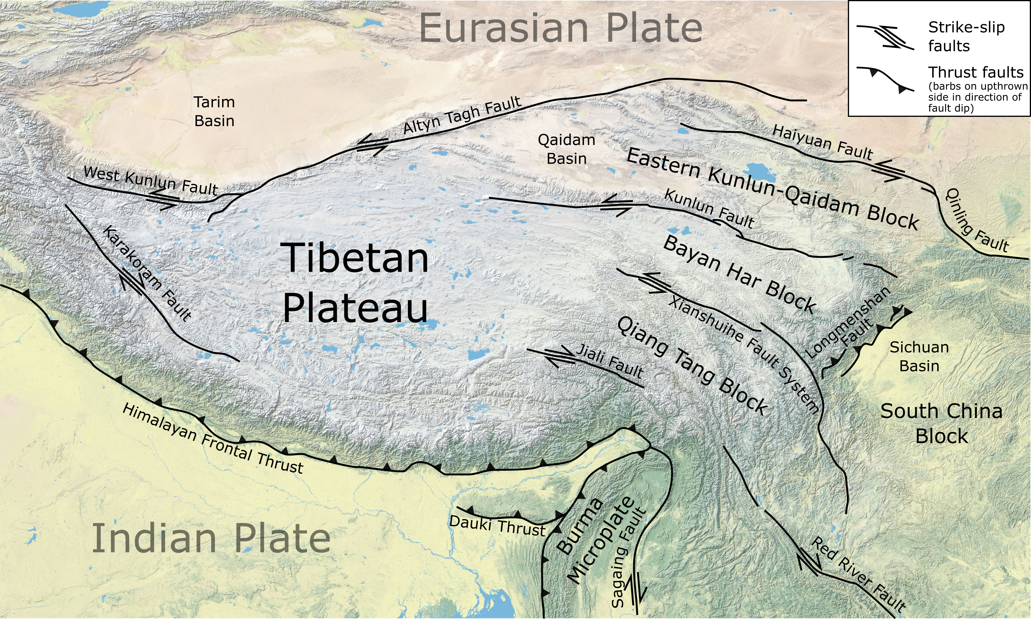 ภาพของที่ราบสูงทิเบตที่เกิดรอยเลื่อนมากมายลากยาวลงมาอันเนื่องมาจากการชนของแผ่นอินเดียและแผ่นยูเรเซีย ซึ่งรอยเลื่อนสะกายก็เป็นอีกรอยเลื่อนที่มีต้นกำเนิดมาจากแนวการชนกันของสองแผ่นนี้ซึ่งเราจะพบแผ่นย่อยพม่าอยู่ในจุดของรอยเลื่อนด้วย ที่มา – Mikenorton