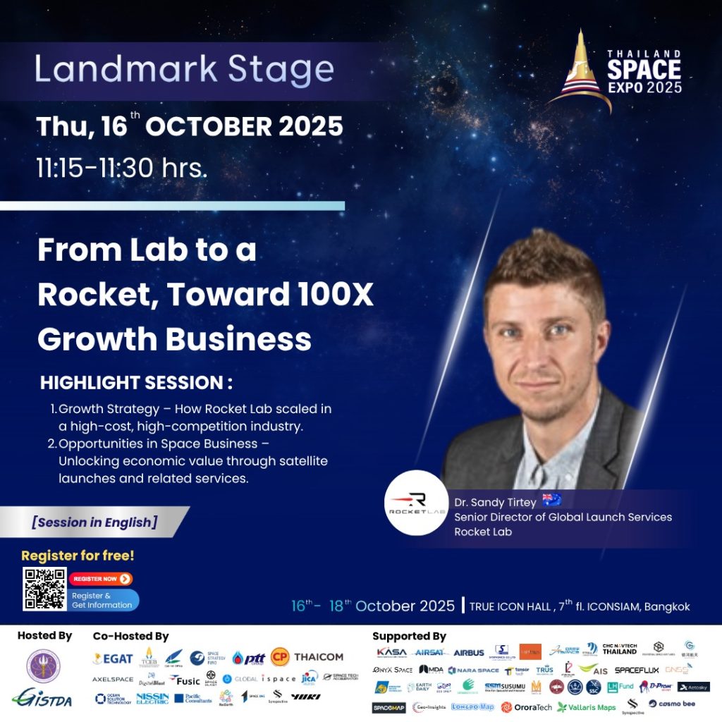 รายชื่อของ Speaker ในปีนี้ถือว่าไม่ธรรมดาเพราะได้ถึงระดับผู้บริหารองค์การอวกาศญี่ปุ่น JAXA คุณ Hiroshi Yamakawa มาพูดบนเวที Plenary Stage ในหัวข้อ Space for Our Future ในช่วงพิธีเปิดวันที่ 16 ตุลาคม 2025 หรือบริษัทอวกาศระดับโลกอย่าง Rocket Lab ที่ส่งคุณ Sandy Tirtey ผู้ดูแลตลาดการปล่อยจรวดมาพูดในหัวข้อ From Lab to a Rocket หรือ Planet เจ้าของเทคโนโลยีดาวเทียมถ่ายภาพระดับโลก, Synspective เจ้าของเทคโนโลยีกลุ่มดาวเทียม SAR ไปจนถึงบริษัท ArianeSpace เจ้าของจรวดอย่าง Vega และ Ariane ซึ่งนับว่าน่าตื่นเต้นมากที่บริษัทอวกาศที่เติบโตอย่างก้าวกระโดดได้มาพูดในงานนี้