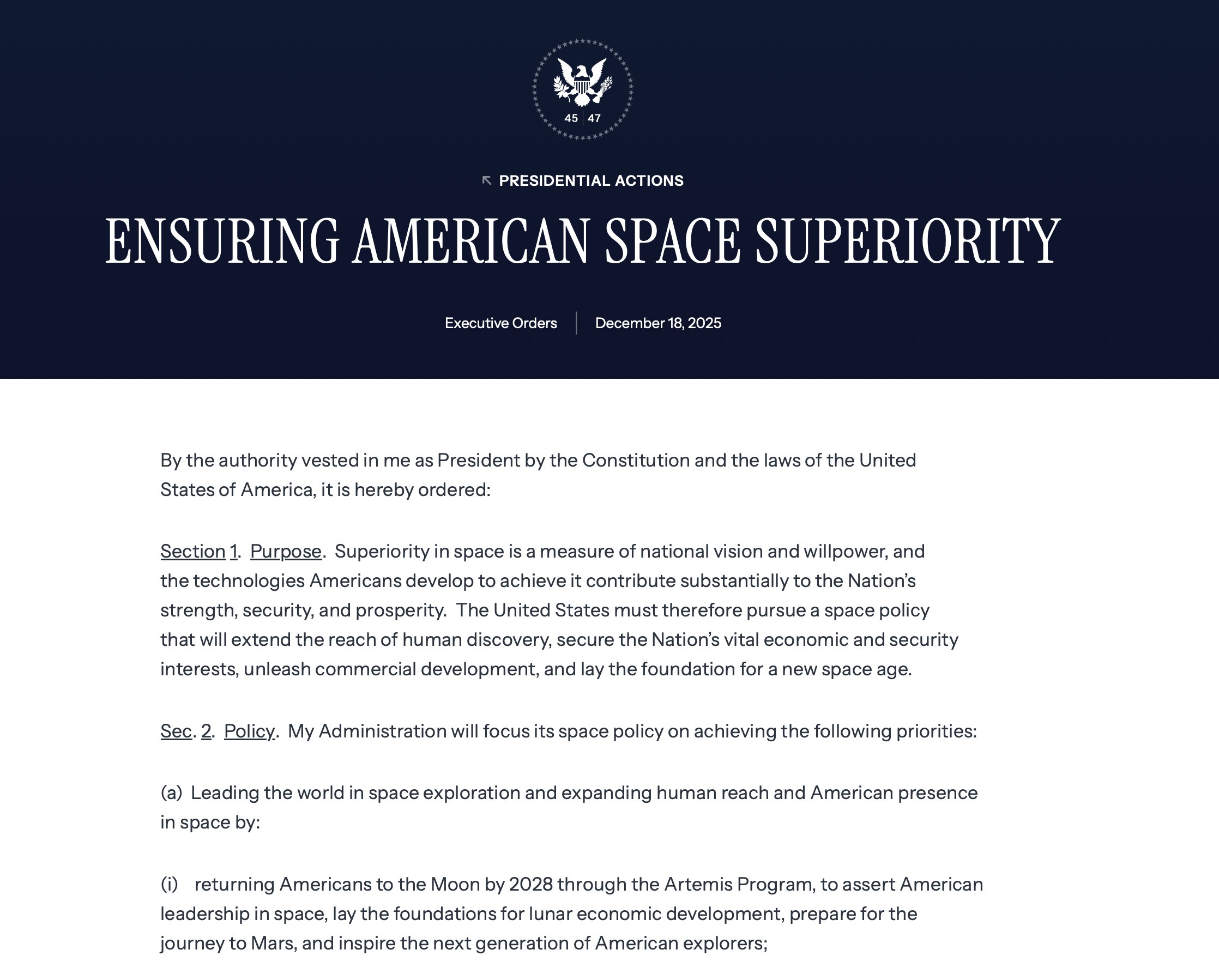 คำสั่งนี้มีชื่อว่า Ensuring American Space Superiority คำสั่งดังกล่าวผลักดันให้เกิดการขยายบทบาทภาคเอกชนอย่างเป็นระบบ ตั้งแต่การเพิ่มอัตราการปล่อยจรวด ลดต้นทุนต่อภารกิจ ไปจนถึงการสนับสนุนเศรษฐกิจอวกาศเชิงพาณิชย์ โดยตั้งเป้าดึงเงินลงทุนใหม่เข้าสู่ภาคอวกาศสหรัฐมากกว่า 50 พันล้านดอลลาร์ภายในปี 2028 พร้อมกับการเตรียม “Commercial Successor” มารับช่วงต่อสถานีอวกาศนานาชาติภายในปี 2030 ซึ่งสะท้อนแนวคิดว่า Low Earth Orbit หรือ LEO ไม่ควรเป็นพื้นที่ที่รัฐต้องถือครองเพียงฝ่ายเดียวอีกต่อไป
